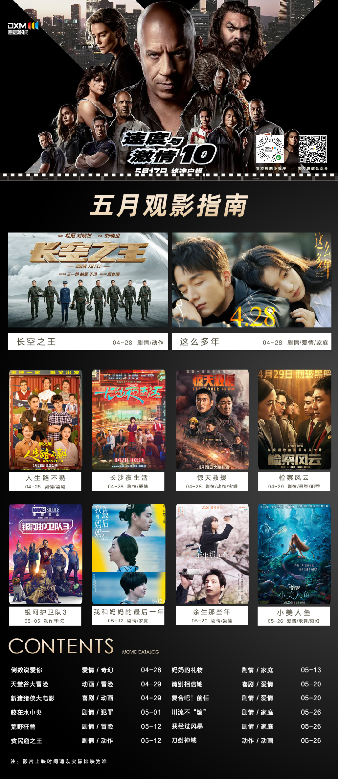 五月,影片类型有动作、悬疑、爱情、喜剧、动画片等,给观众提供了丰富的观影选择,其中燃爆动作巨制《速度与激情》,将于5月17日终途启程。